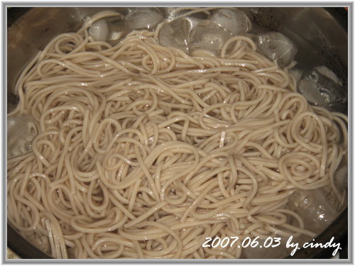 洗好後的麵條,全數泡在冰塊水中